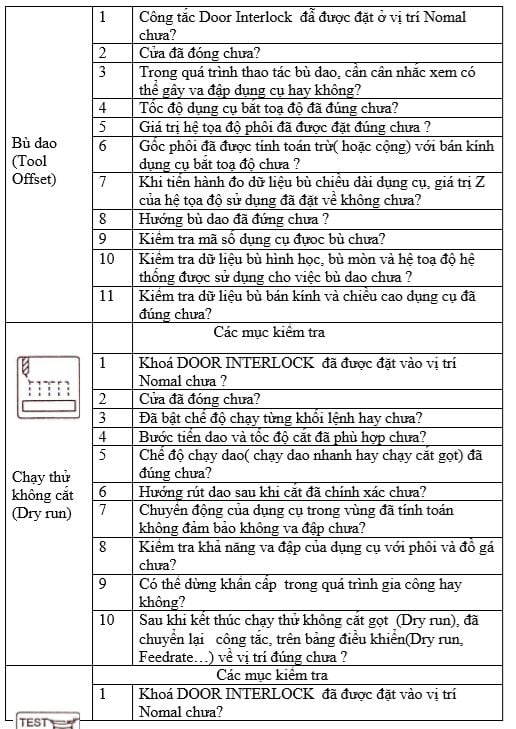 Các mục cần kiểm tra trước khi gia công được tóm tắt theo bảng sau. Kiểm tra những mục này để đảm bảo quá trình gia công chính xác và an toàn.