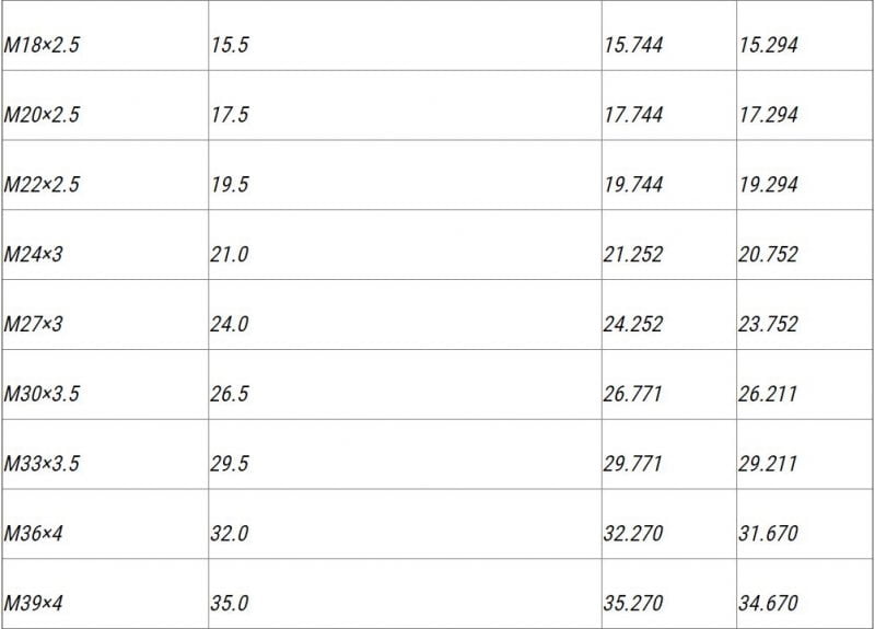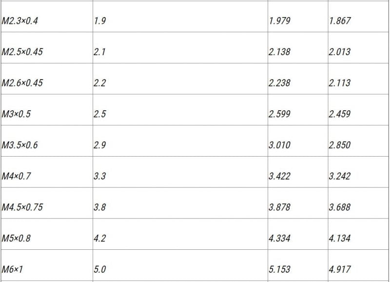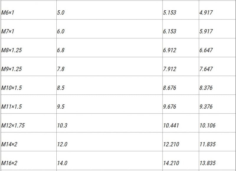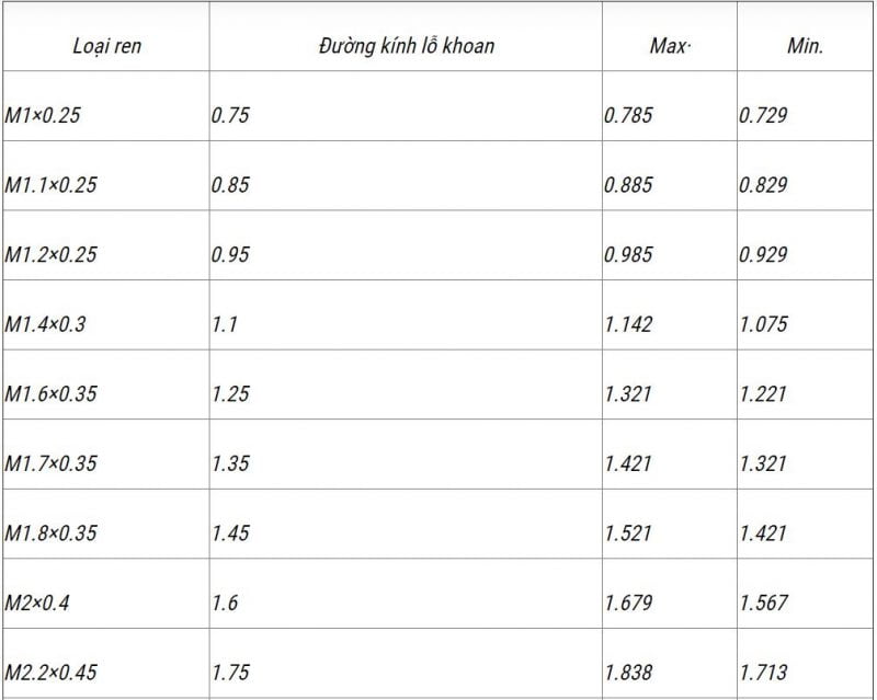 Bảng tra cứu đường kính lỗ khoan tương ứng để taro và tra cứu bước ren theo chuẩn ISO nhằm xác định được các bước ren phổ biến đối với từng size taro đồng thời xác định kích thước lỗ cần khoan trước khi taro. Dưới đây là bản tra đường kính lỗ khoan tương ứng khi taro đầy đủ nhất: