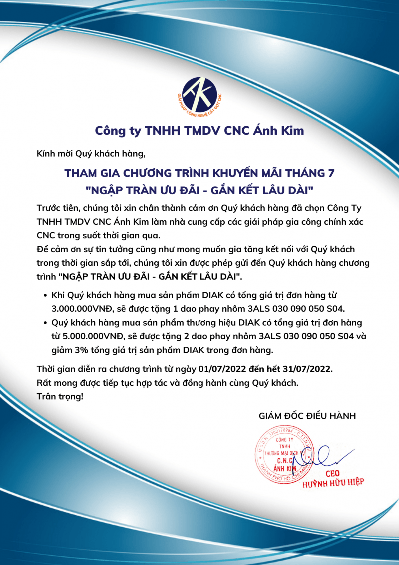 Chào đón mùa hè sôi động, CNC Ánh Kim thân gửi đến Quý khách hàng Chương Trình Khuyến Mãi tháng 7 “NGẬP TRÀN ƯU ĐÃI – GẮN KẾT LÂU DÀI” khi mua các sản phẩm DIAK.