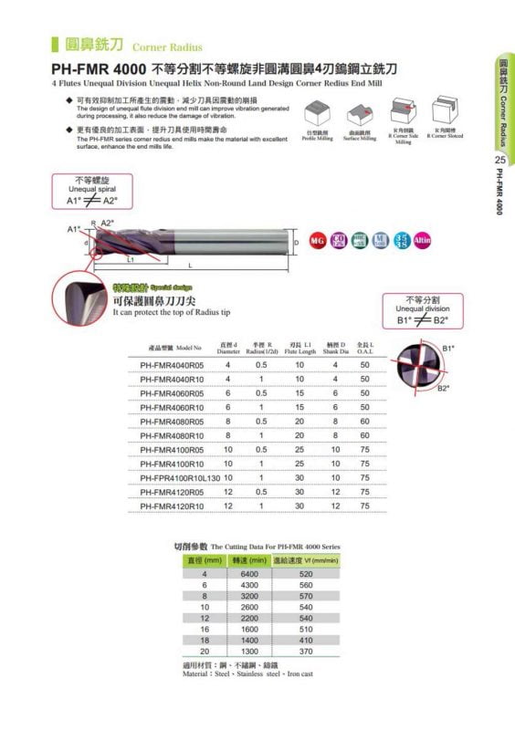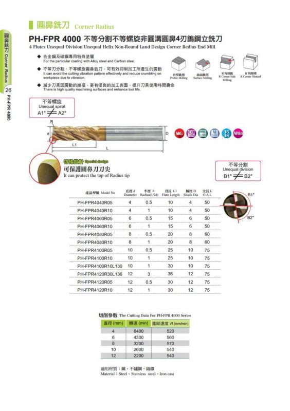 – Dòng dao phay được sản xuất với nguyên liệu nhập khẩu mới nhất, có thể gia công các vật liệu có độ cứng lên đến 55 HRC