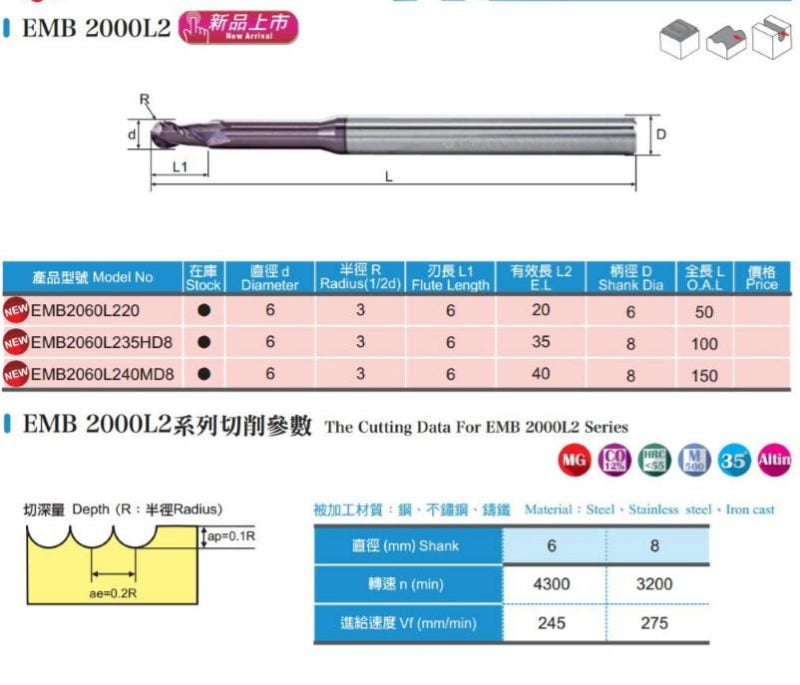 Dao phay cầu Echain có độ cứng gia công các vật liệu lên đến 55HRC, phù hợp gia công phay kim loại, hợp kim sắt, thép carbon, thép hợp kim gang, inox,…