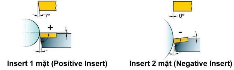 Insert hai mặt (Negative Insert) có góc thoát phoi bằng 0°, trong khi Insert một mặt (Positive Insert) có góc thoát phoi nhỏ hơn 90 °. Hình minh họa của loại Positive Insert và Negative Insert cho thấy cách Insert được lắp ráp cán dao và góc nghiên khi tiếp xúc phôi.