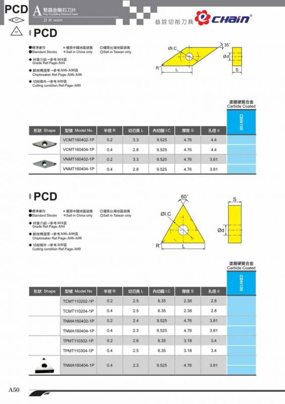 Các mã insert PCD Echaintool