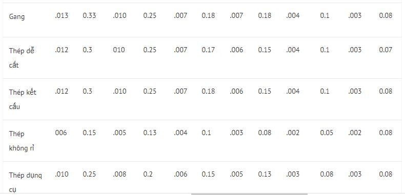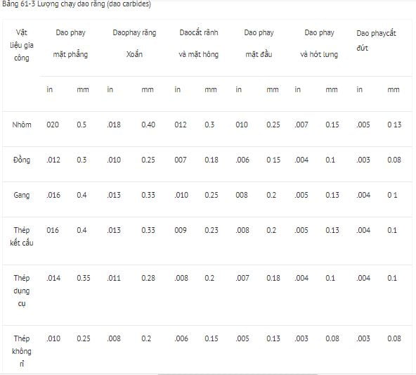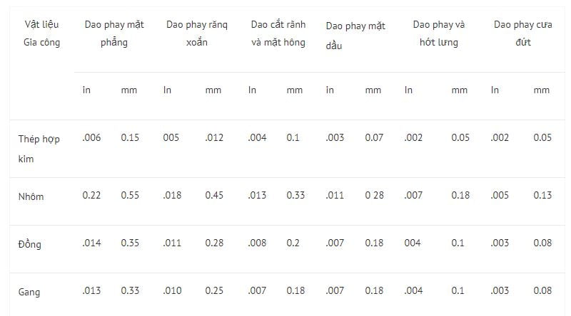 Ghi chú: Lượng chạy dao tính theo công thức này chỉ đúng cho điều kiện lý tưởng. Trong các điều kiện gia công trung bình và đặc biệt trong các Xưỡng Trường, lượng tiến trên máy phay nên được xác lập theo 1/3 hoặc 1/2 giá trị tính toán, sau đó có thể tăng dần tùy theo khả năng của máy và độ bóng được yêu cầu.