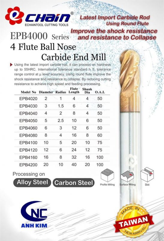 - Dao phay EPB4000 đây là dòng sản phẩm mới của hãng Echain, với thiết kế 4 lưỡi cắt, gia công vật liệu với độ cứng lên đến 55HRC