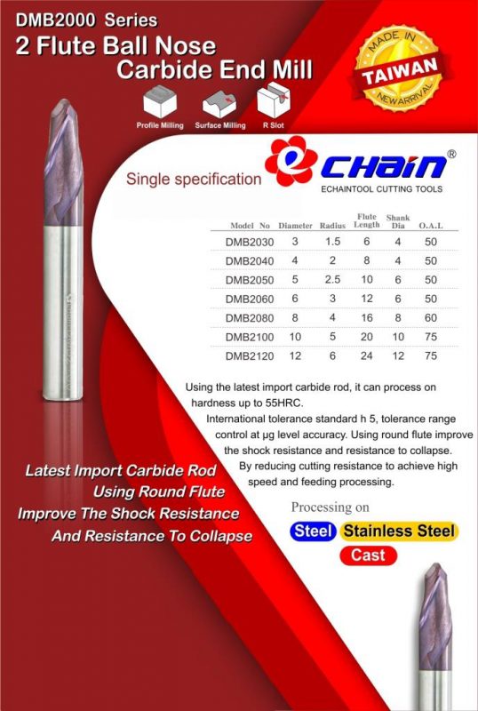 - Dao phay cầu DMB2000 được sử dụng nguyên liệu nhập khẩu tốt nhất, đươc làm từ hợp kim cứng có thể xử lý gia công những vật liệu có độ cứng cao